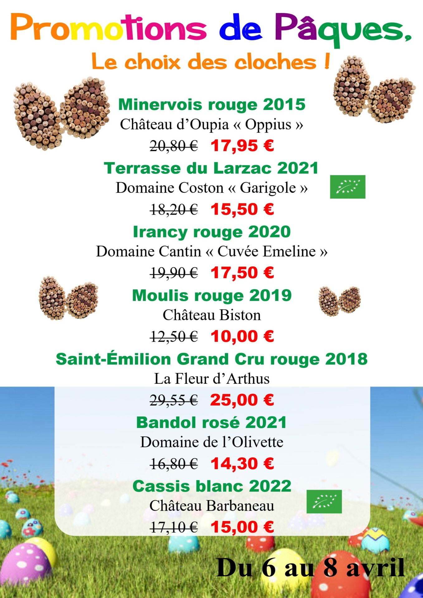 Le choix des cloches (et non "le choix pour les cloches ) Nous vous avons pondu des promotions de Pâques très alléchantes... Voir la liste en image. Flavia vous propose d'en déguster quelques unes : ♥ Irancy "Cuvée Emeline" Domaine Cantin ♥ St Emilion Grand Cru La Fleur d'Arthus ♥ Cassis Château Barbaneau