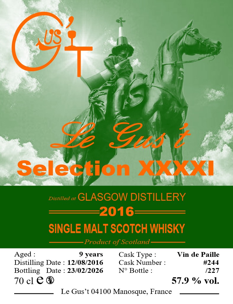 - Glasgow Distilley 2016 Selection XXXXI, c’est le dernier fût de la trilogie Glagow Distillery que Le Gus’t avait acheté en sorti d’alambic… Nous avions envoyé à la Glasgow Distillery ce fût vide de vin de paille de Frédéric Lornet, vigneron à Montigny lès Arsures dans le Jura et le distillat a été mis en vieillissement directement dans ce fût. Ce fût a fait un excellent travail !!!